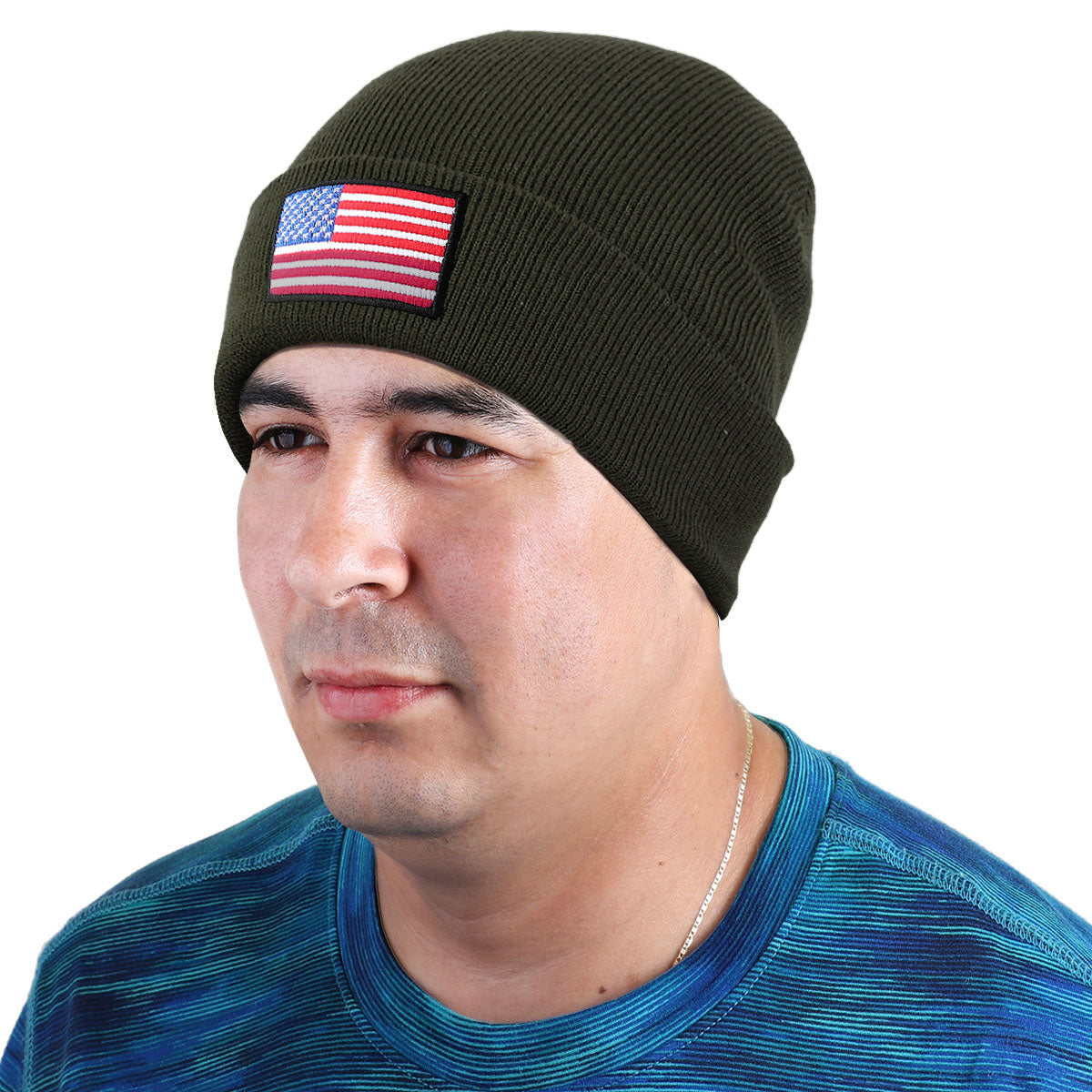 American Flag Embroidered Beanie Hat - Olive